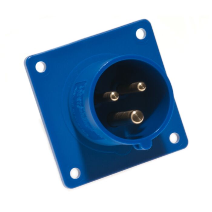CEE 3P 16A, IP44, Han chassis stik i blå til indbygning, i kraftig kvalitet fra PCE. Flange måler 70 x 70mm.