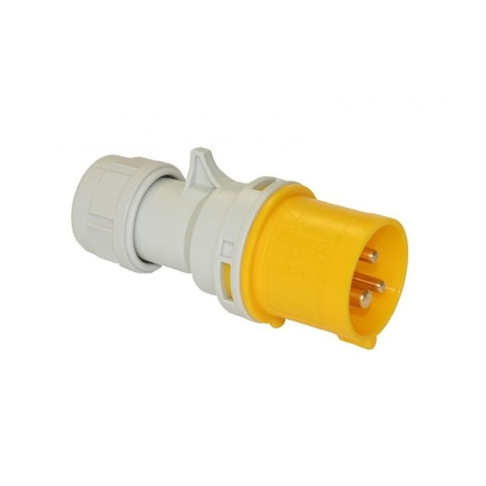 CEE 110V 3P 32A, IP44, Han stik for kabel (stikprop) i gul, i kraftig kvalitet fra PCE. Hurtig at montere da front og kappe nemt klikkes sammen uden skruer, og aflastningen spændes til med håndgreb.