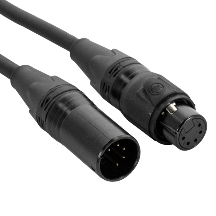 Dette færdigsamlede 5-polede DMX-kabel IP65 er en driftssikker løsning til professionelle lys- og sceneløsninger. Kablet er opbygget med en impedans på 110 ohm, hvilket sikrer stabil og præcis signaloverførsel til DMX-styring af lamper, moving lights og andet lysudstyr.