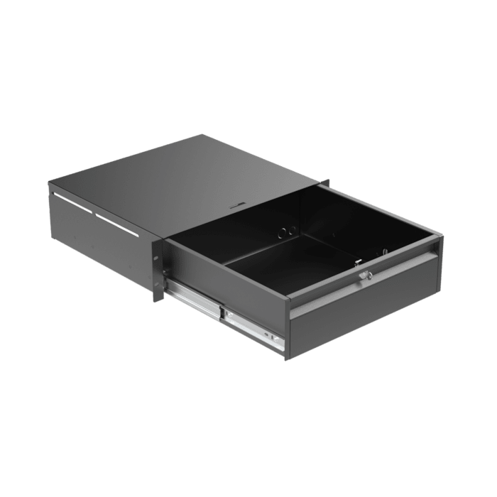 The RDx20x series of 19” rack drawers comes available in 1U, 2U and 3U unit heights with and without lock. The chassis is constructed of 1,5 mm thick cold rolled steel, while the tray is finished in 1,2 mm thick cold rolled steel. They feature full extension 3 section drawer rails, pushout holes on the back of the tray for cable insertion, a rubber anti slip liner, a full-width handle and optional back supports (RD2S) for increased load capacity (only 2U and 3U).