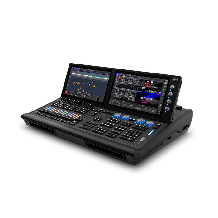 Pulten har to indbyggede touchskærme i Full HD opløsning, 4 DMX porte og indbygget netværks switch.