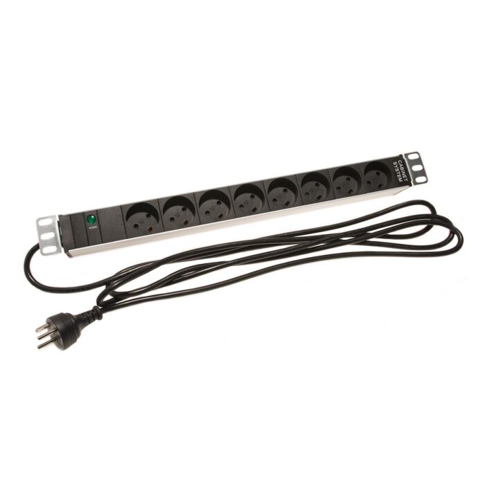Stikdåse i sølv/sort med 8 x 3 Pol DK udtag med jord, sænket kontakt og med 2 meter kabel. Passer perfekt i et 19" rack og fylder kun 1 unit. Med glimlampe så du kan se, når der er sat støm til.