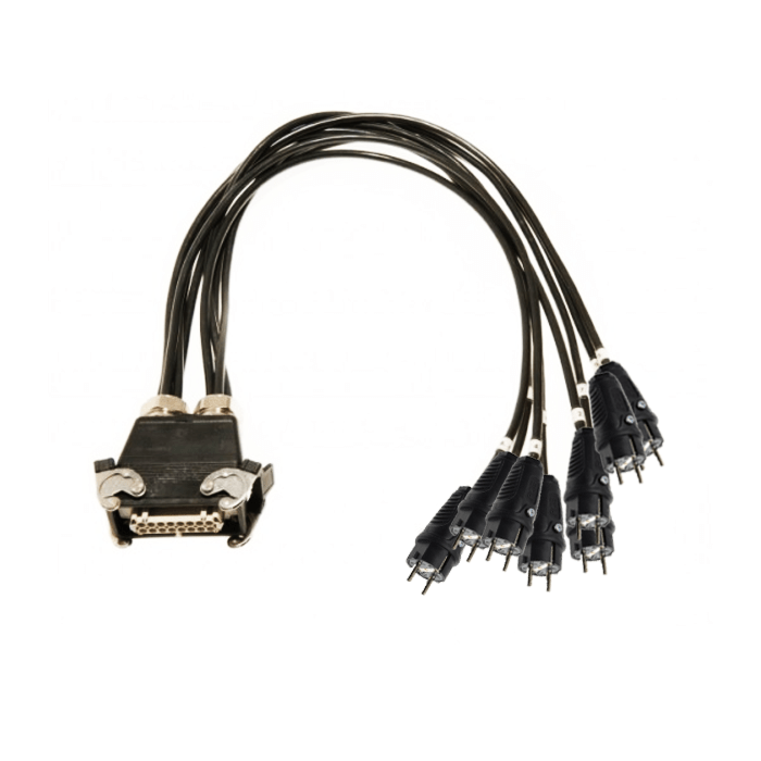 Indtagspisk med 8 x Schuko til ILME 16 polet Hun. Kablerne er mærket med 1-8 og alle stik er sorte. Effektiv kabellængde: 85cm