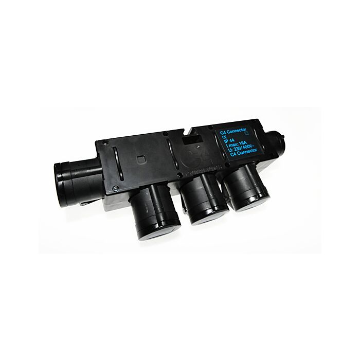 Som et alternativ til de kendte kompaktforgrenere, har vi også C4 forgreneren. Den har 1 stk 16A 3-polet CEE ind og 4 stk 16A 3-polede CEE ud - med 3 stik ud i den samme retning og et til viderelink.