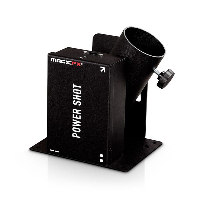 MAGIC FX Power Shot I er en kompakt konfettikanon som kan affyrre elektriske konfettirør og streamers. Power Shot I kan placeres på scener ved brug af en MAGIC FX Baseplate I som sørger for at konfettikanonen står sikkert og ikke vælter. Power Shot kan også monteres på truss.
