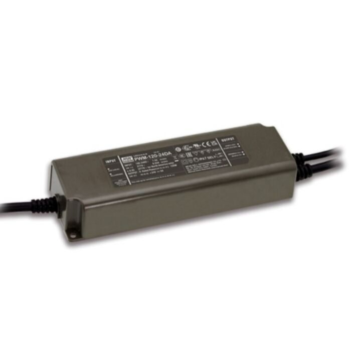 Mean Well 24V 120W dæmpbar strømforsyning / LED driver. Constant voltage. PWM dæmpet output. IP67 for inden- og udendørs brug.