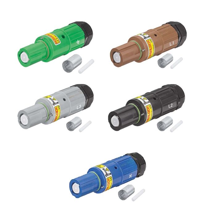 Powerlock er godkendt til 400A / 1000V, og er IP67 når stikkene er connected. Det er et meget anerkendt og brugt stik i Europa. Med powerlock har du 1 stik pr. leder, så der er henholdsvis L1 (Brun), L2 (Sort), L3 (Grå), Nul (Blå) & Jord (Grøn) i hver sit separate kabel. (Farvekode efter europæisk standard).