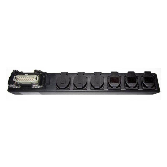 Let og kompakt stikplanke med 16-polet ILME (Harting) ind og 6 x Schuko udtag med jord, 3-polet. Perfekt til diskret strømdistribution. Stikplanken er lavet med ILME stik og Schuko stik.