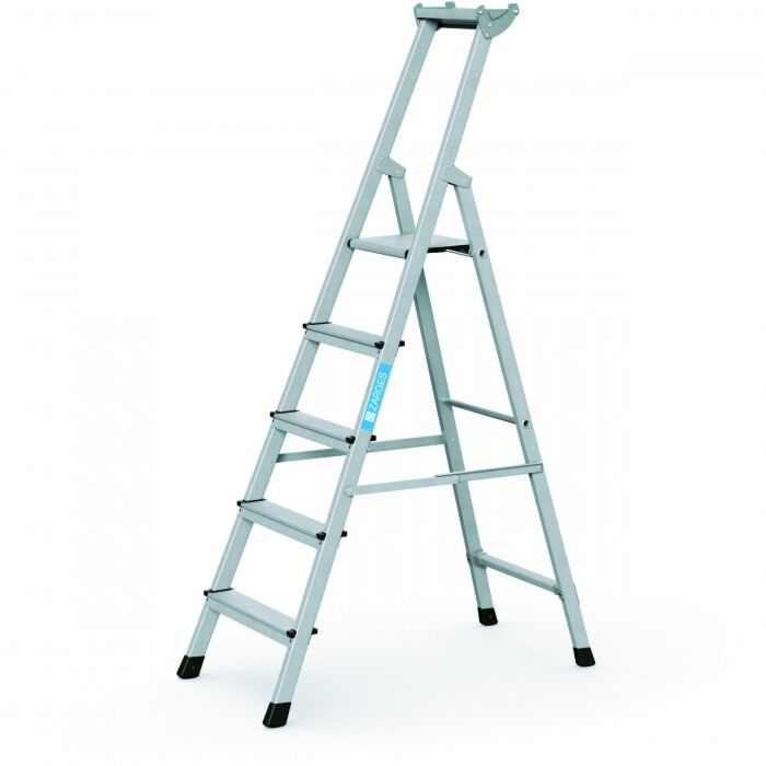 Robust Zarges trappestige med 5 trin og en platformhøjde på 1,24 meter, for en sikker og bekvem stilling, også i forbindelse med længerevarende arbejde.